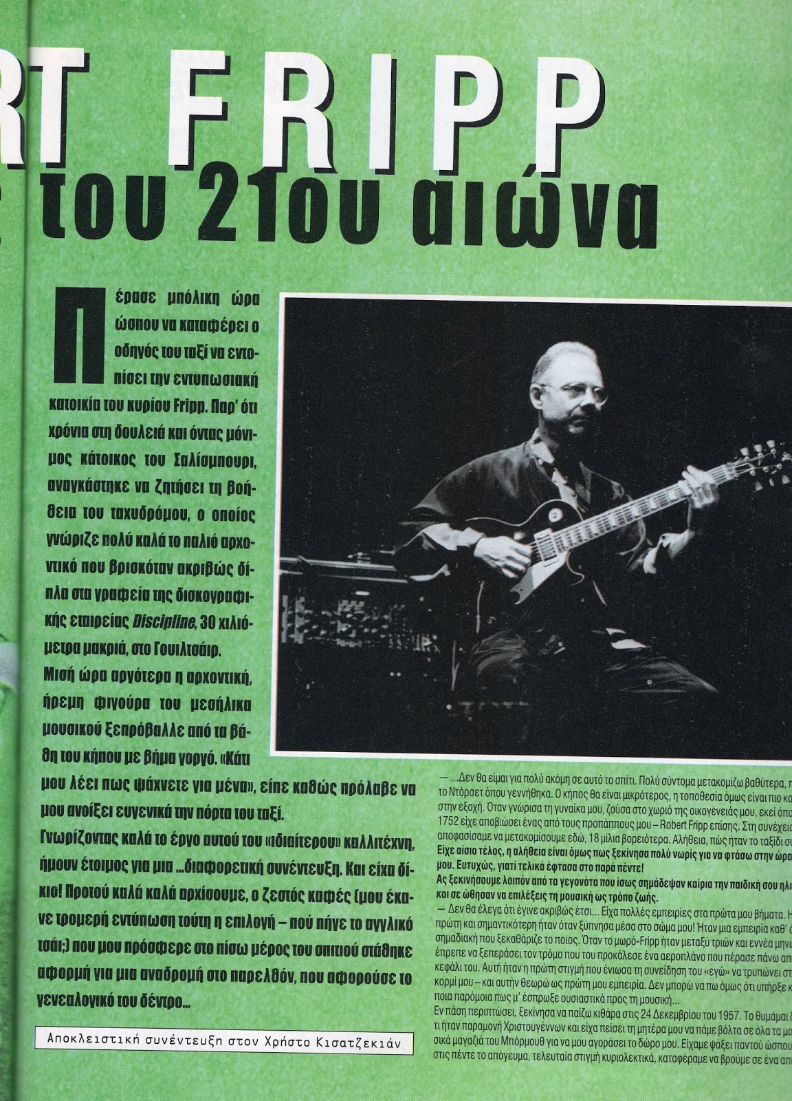 Υ.γ. :Η συνέντευξη του Robert Fripp δημοσιεύτηκε στο περιοδικό ΠΟΠ-ΡΟΚ, τεύχος 245 Οκτ. 1999, καταλάμβανε 5 σελίδες και επειδή το ενδιαφέρον της ήταν πολύ μεγάλο, ο τότε υπεύθυνος του περιοδικού, Θοδωρής Μανίκας για να μην της κόψει ούτε λέξη, άφησε έξω διαφημιστική καταχώρηση!